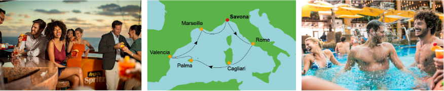 Vanuit Savona gaan we naar Rome, de eeuwige stad, waar u de geschiedenis en cultuur van Italië kunt ontdekken. Daarna zetten we koers naar Cagliari, de hoofdstad van Sardinië, waar u kunt genieten van de prachtige stranden en kristalheldere wateren van het eiland.
