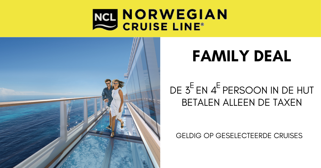Bij Norwegian Cruise Line reist uw gezelschap extra voordelig mee: de 3e en 4e persoon in de hut betalen alleen de havengelden en taxen.