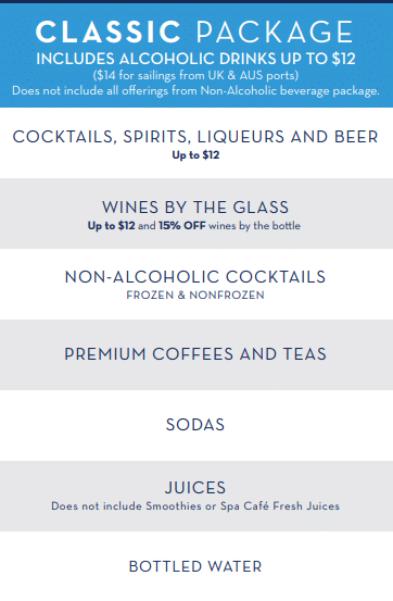 Tous les passagers partageant la même cabine doivent souscrire au même forfait boissons. Il est interdit de partager ou de transférer les forfaits boissons. Les forfaits sont disponibles pour les croisières d’au moins cinq nuits.