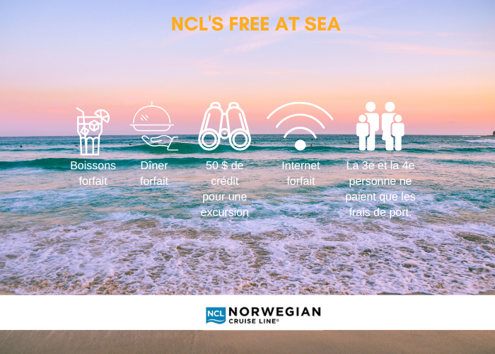 Découvrez la commodité d’une croisière tout compris à bord des navires Norwegian Cruise Line. Ajoutez un forfait Free at Sea à votre croisière et profitez pleinement de votre séjour à bord. Vous n’aurez plus à vous soucier de rien !