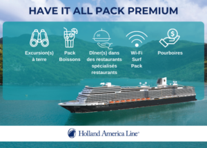 Pour les voyageurs qui apprécient les vacances tout compris avec des extras inclus dans le prix, Holland America Line a lancé le forfait premium « HAVE IT ALL ». Ce forfait comprend des excursions, un forfait boissons, des dîners dans des restaurants spécialisés et le Wi-Fi. Ce forfait (à ne pas confondre avec notre précédente promotion Have It All) est disponible toute l’année sur toutes les croisières de 6 nuits ou plus, à l’exception de nos Grand Voyages.