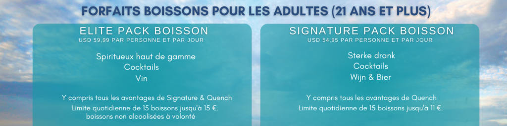 Tous les passagers partageant la même cabine doivent souscrire au même forfait boissons. Il est interdit de partager ou de transférer les forfaits boissons. Les forfaits sont disponibles pour les croisières d’au moins cinq nuits.
