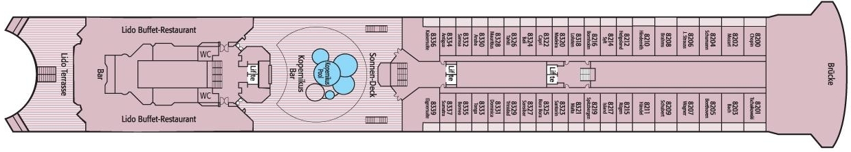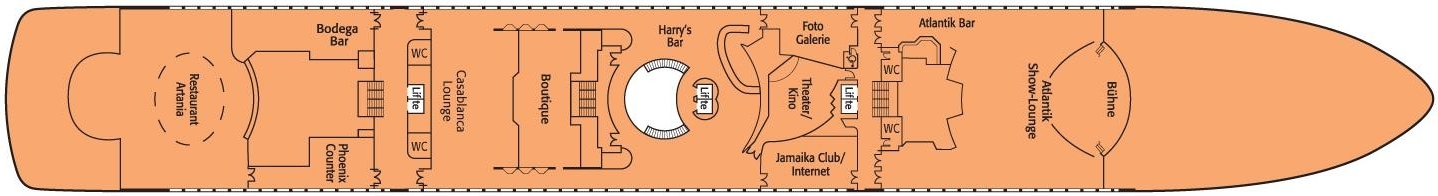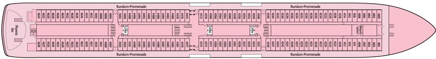 Licht overgoten binnen promenades, 6 liften en verschillende trappenhuizen zijn beschikbaar. De buitendekken bieden voldoende beschutte ligplaatsen, 2 zwembadgedeeltes, een klassiek achterterras met de bekende Phoenix Bar en een allround promenade. Het “uitkijk” -schip voor de boeg en het onbelemmerde terrassteven laten de harten van maritieme liefhebbers sneller kloppen, want ze bieden prachtige uitzichten.
