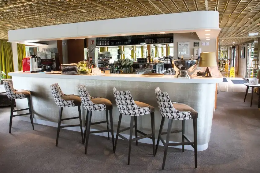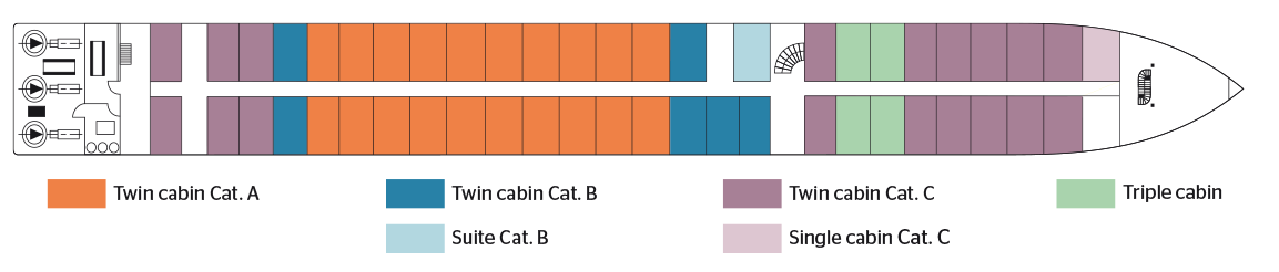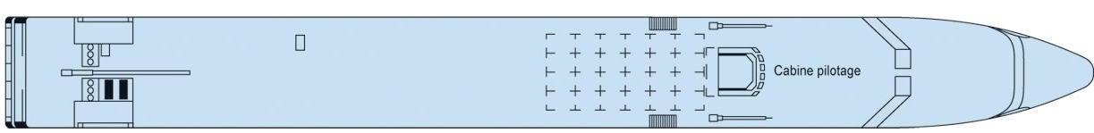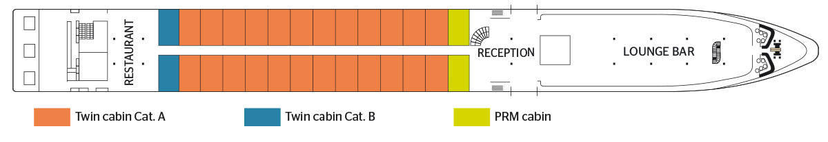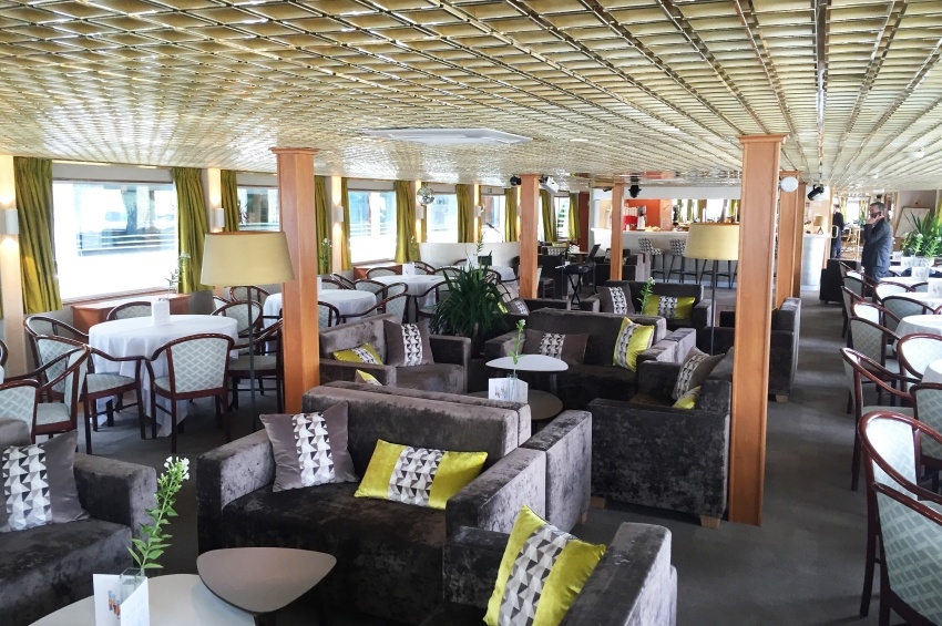 Lounge-bar met dansvloer – bar – eetkamer – groot zonnedek met ligstoelen – bibliotheek – cadeauwinkel.