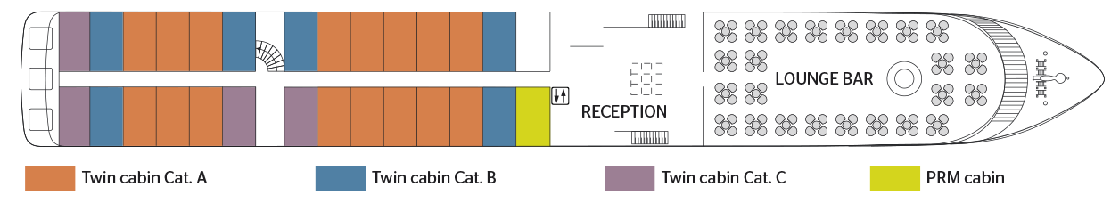 Faciliteiten omvatten de lounge – bar met een dansvloer – Eetzaal 178 plaatsen – pianoramabar 30 plaatsen – ruim zonnedek met ligstoelen – Franse balkons – lift – cadeauwinkel. Centrale verwarming, 220V elektriciteit, airconditioning, radar, tv en video in de lounge, wifi aan boord.