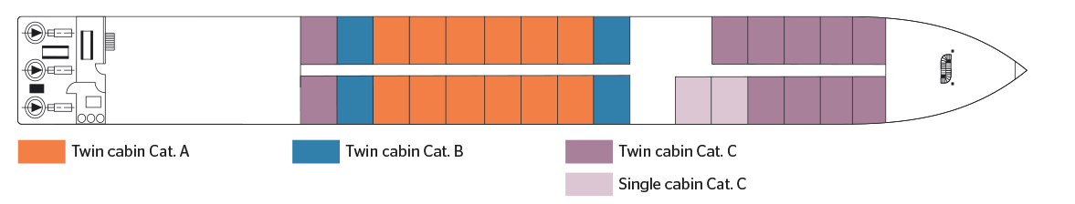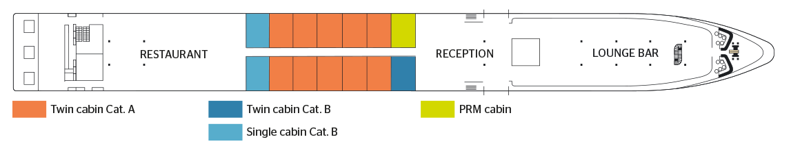 Lounge met centrale bar – eetkamer – groot zonnedek met ligstoelen. Gehele schip is voorzien van verwarming en airconditioning (inclusief iedere kajuit afzonderlijk). Wi-Fi aan boord.
