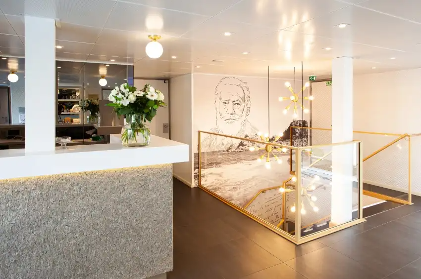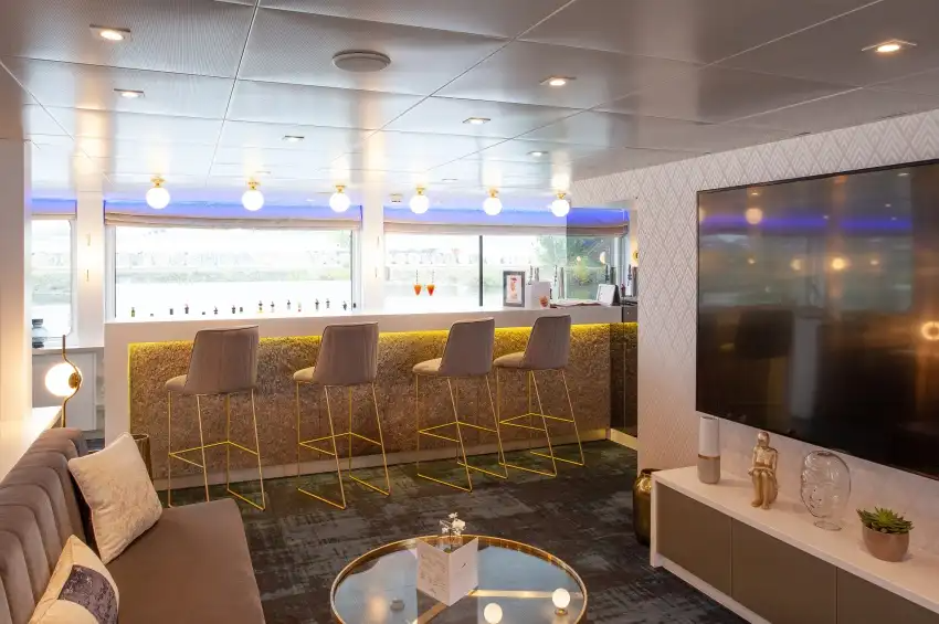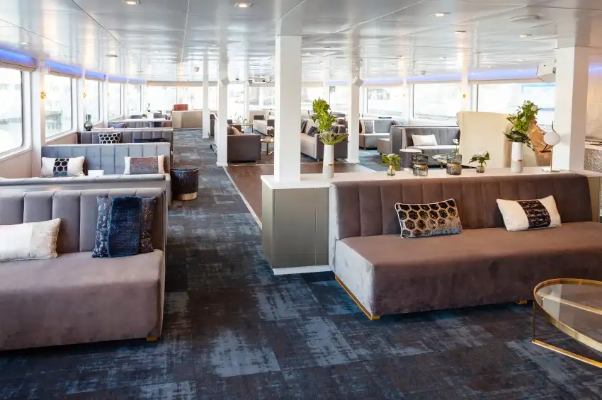 Lounge-bar met dansvloer – bar – eetkamer – groot zonnedek met ligstoelen – cadeauwinkel. Centrale verwarming, 220V elektriciteit, airconditioning, radar, radiofoon, Wi-Fi aan boord.