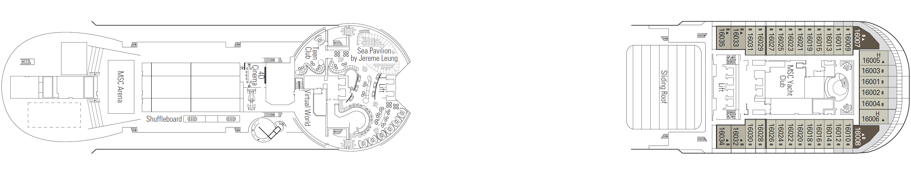 De voordek van het schip is de thuisbasis van de exclusieve MSC Yacht Club, een luxe schip-in-een-schip met 71 ruime suites, een eigen conciërgereceptie, 24-uurs butlerservice, privé Top Sail Lounge, pooldeck en bar.